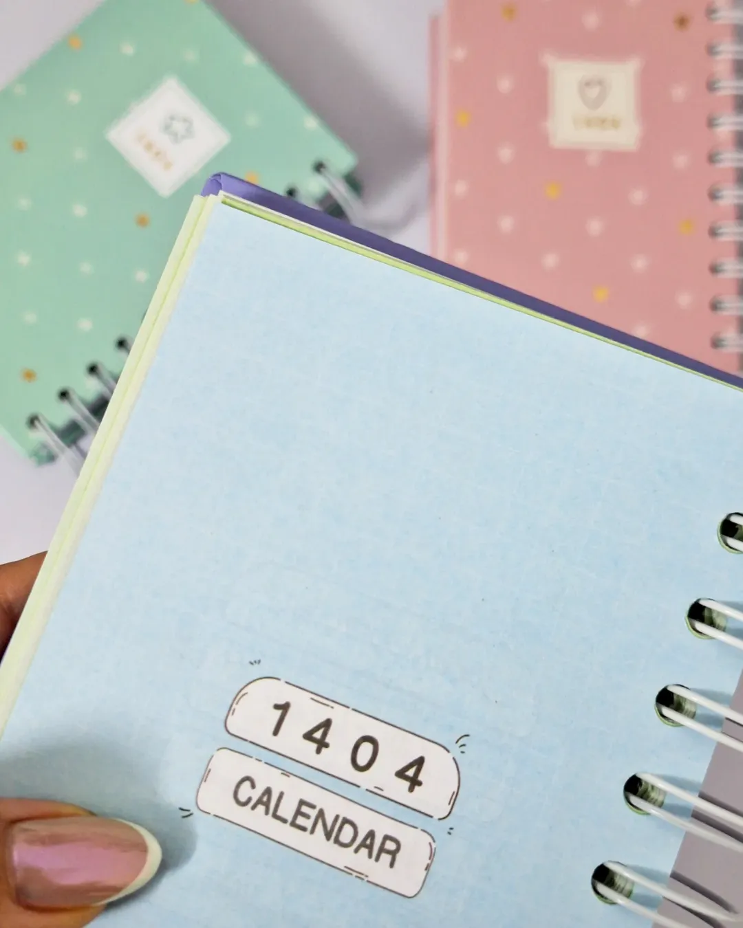سررسید جیبی سیمی دوبل فنر که براحتی داخل کیف هم میتونی بذاریش برای هرروز یک برگه رنگی داره که در کل ۱۹۶ برگه و برای هر فصل رنگ برگهاش متفاوت و پاستلیه